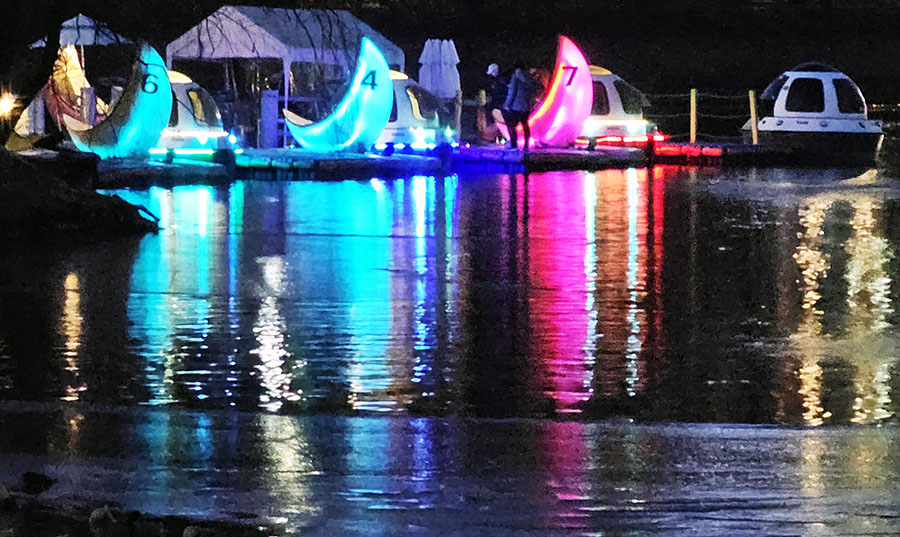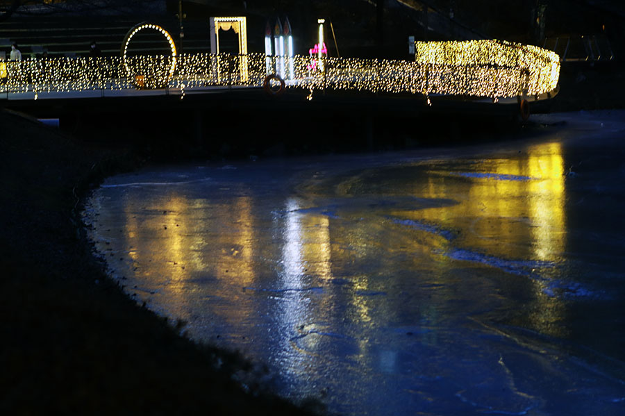 어둠이 내린 저녁의 석촌호수는 또 다른 얼굴을 보여줍니다. 호수 위를 떠다니는 초승달 모양의 문보트(Moon Boat)와 UFO 보트가 형형색색의 조명을 밝히며 물 위로 화려한 빛의 그림자를 드리웁니다. 얼음과 물, 그리고 인공의 빛이 어우러진 반영은 마치 한 폭의 추상화처럼 아름답습니다.