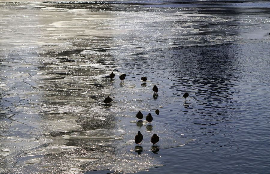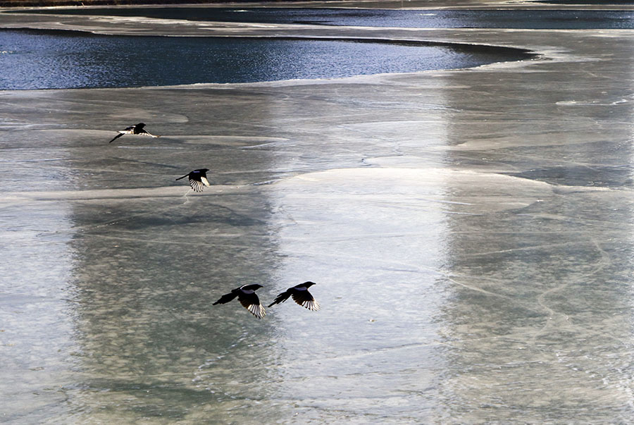호수 위에는 아직 다 녹지 않은 얼음 조각들이 떠 있지만, 그 위로 내려앉은 햇살은 눈부신 윤슬이 되어 반짝입니다. 얼음 위에 나란히 서서 휴식을 취하는 오리 떼와 그 위를 경쾌하게 가로지르는 까치들의 날갯짓에서 곧 다가올 봄의 생동감이 느껴집니다.