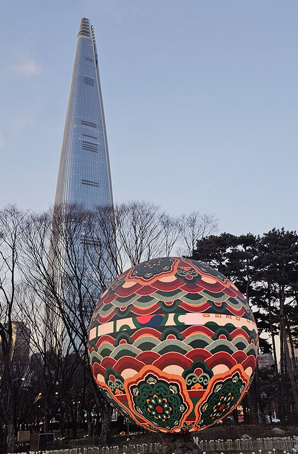 특히 웅장한 롯데월드타워를 배경으로 빛나는 '더 스피어'의 모습은 그야말로 '직관' 필수 코스! 낮에도 예쁘지만, 해가 진 뒤 조명이 들어오면 그 예술성이 더욱 돋보입니다. (사진 찍기 딱 좋은 스폿이에요!)
